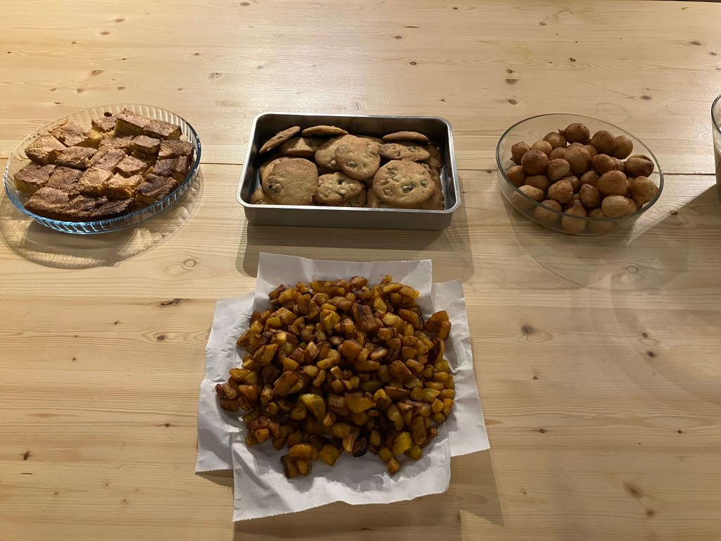 Au menu 🍽️ : jus de kiwi 🥝, cookies 🍪, gâteaux à la poudre d’amandes 🍰, beignets 🍩 et bananes plantains 🍌